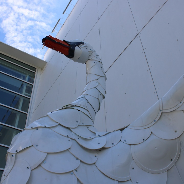 On display outside the front entrance of the National Nordic Museum, the Nordic Swan by Thomas Dambo was installed in June 2022.