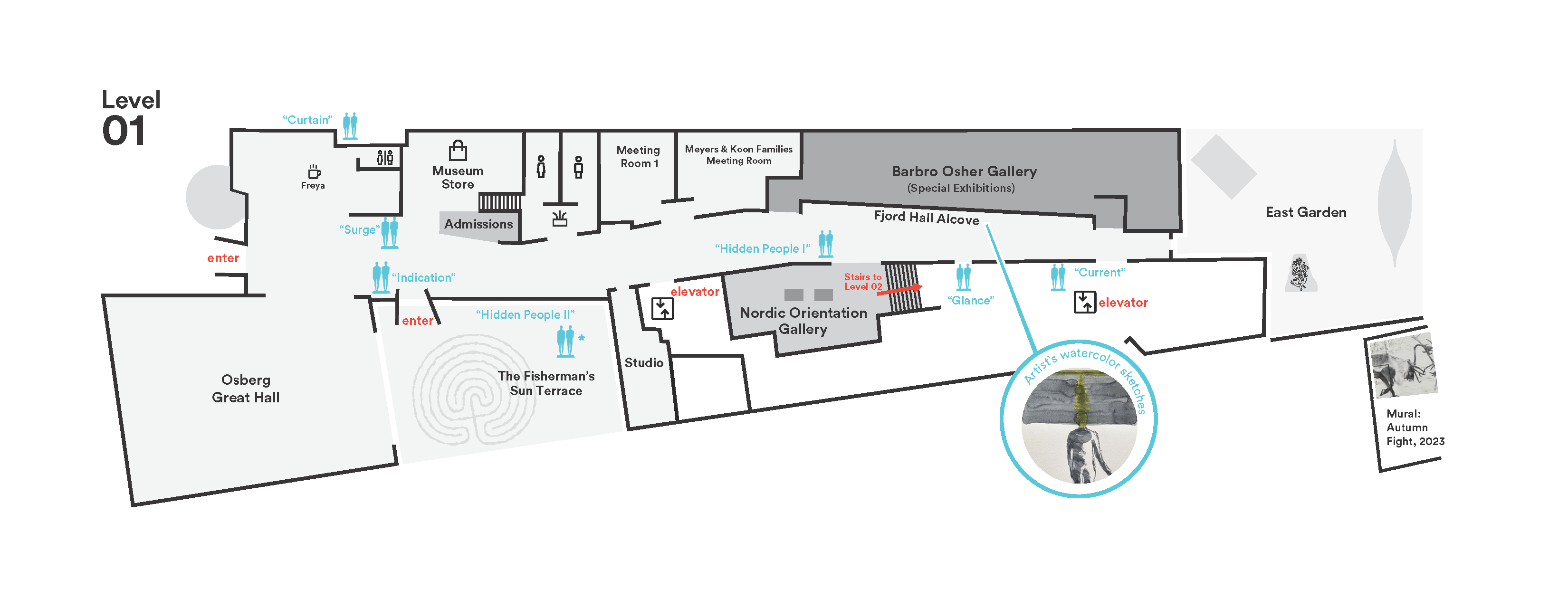 Steinunn Þórarinsdóttir: Wayfinders is organized by Leslie Anderson, Director of Collections, Exhibitions, and Programs, National Nordic Museum. Images courtesy of Steinunn Þórarinsdóttir. For a map of the installation, see below.