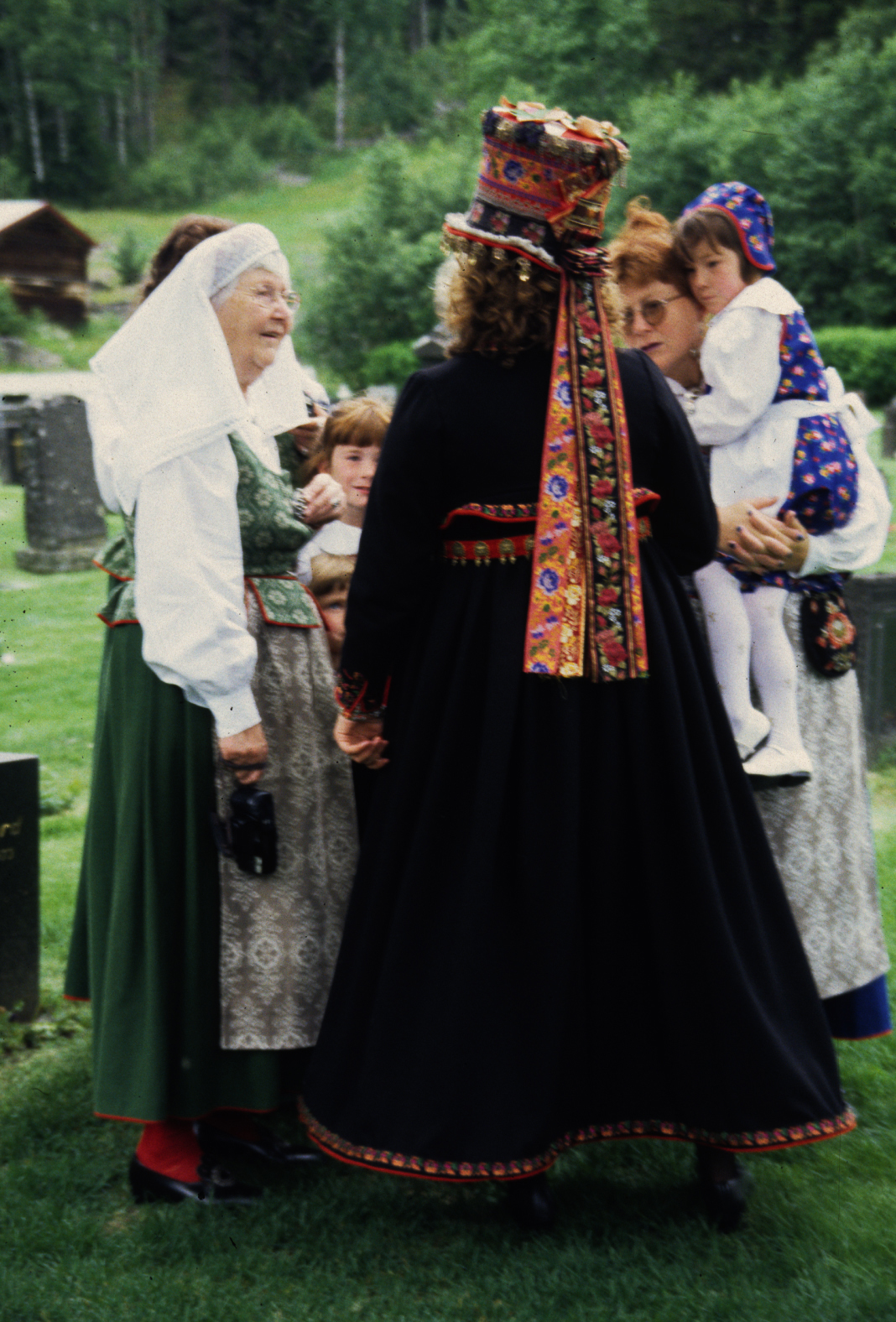In 2000, the bridal hat we made was worn for the first time in nearly 150 years at Volun farm, in Tinn, Telemark. What is more remarkable is that the bridegroom, Hans Vaalund, is the great-great grandson of Ingebjorg Volun—presumably the last bride to have worn the hat in the mid-19th Century. After this, the bridal hat slowly came back into use as others were made. Today, it is not unusual to see a bride from Tinn wearing this beautiful hat on her wedding day.