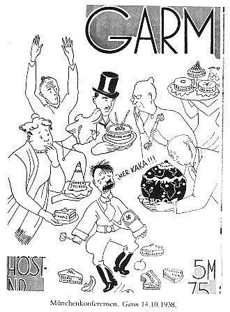 In the 1938 political cartoon, Tove Jansson satirizes Adolf Hitler as well as the countries that were giving into his political demands. The cartoon is Jansson’s satirical take on the Munich Conference in September of 1938 at which Great Britain, France, and Italy agreed to allow Hitler and Nazi Germany to annex a German-speaking area of Czechoslovakia. Czechoslovakia had not been invited to attend the conference. Here Jansson mocks Hitler, portraying him as a spoiled brat who is throwing a temper tantrum to get more cake (symbolizing land), while the leaders of England, France, and Italy worriedly and subserviently comply.